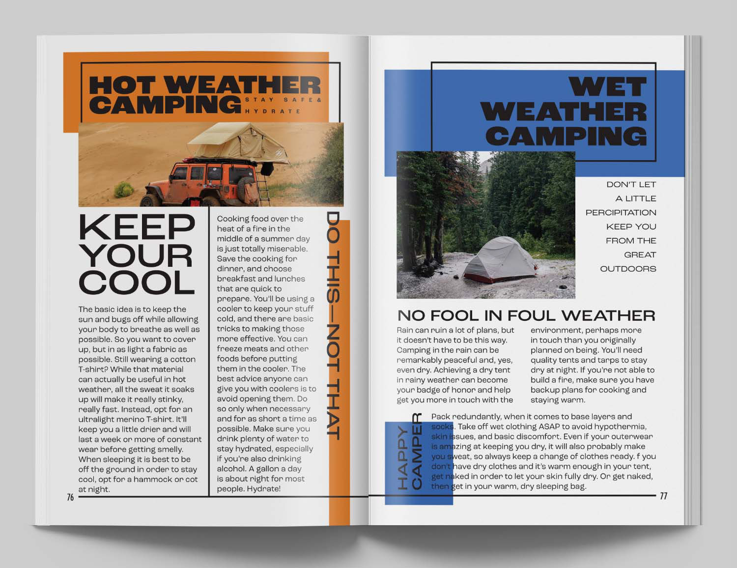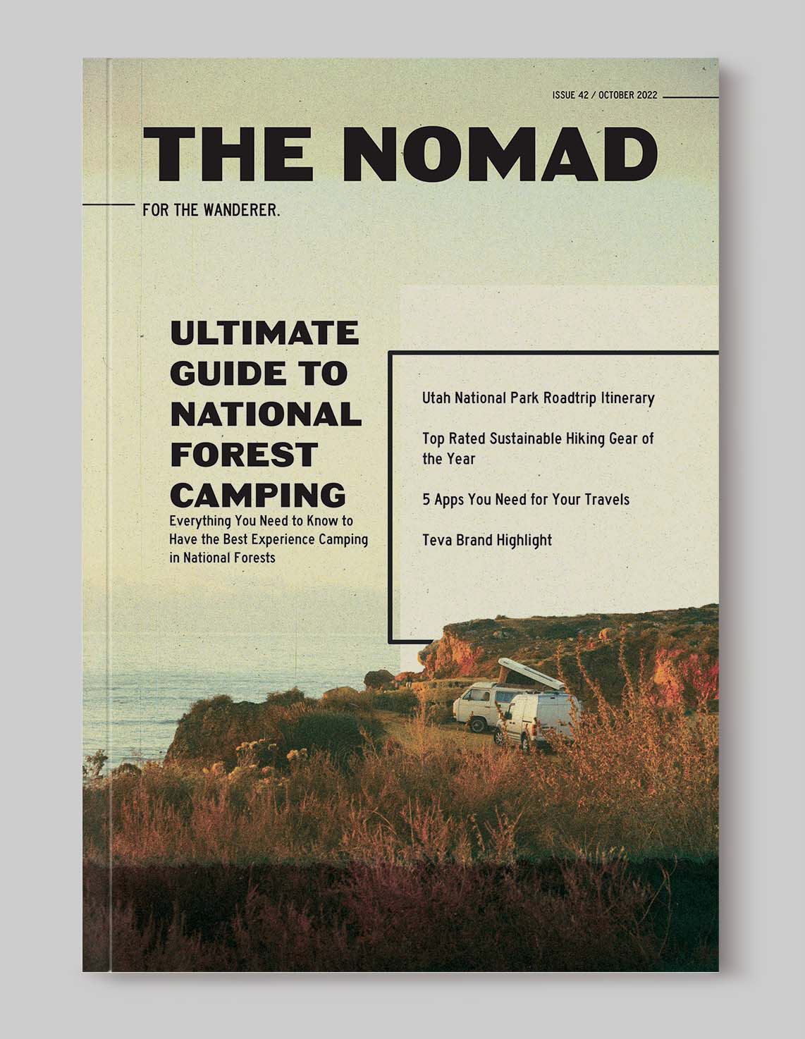 Nomad Magazine is a magazine concept for outdoor adventures with an emphasis on car camping. The project includes two issues, each with featured articles and brand highlights.